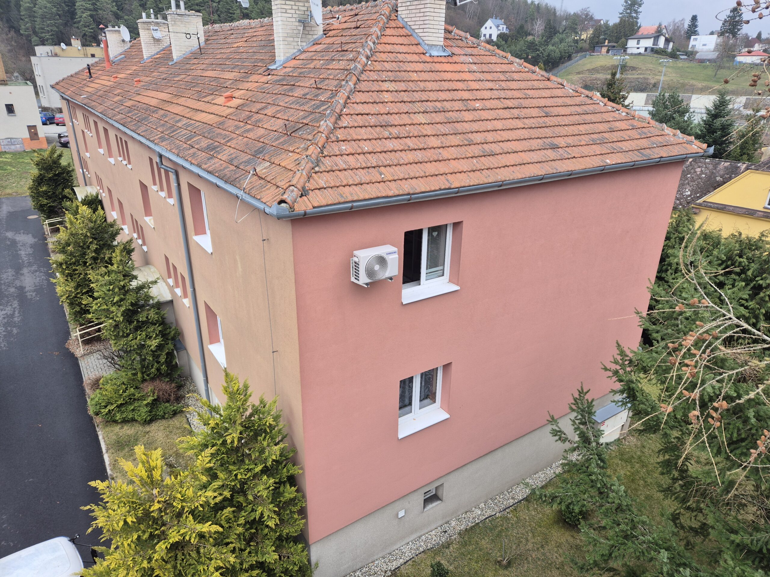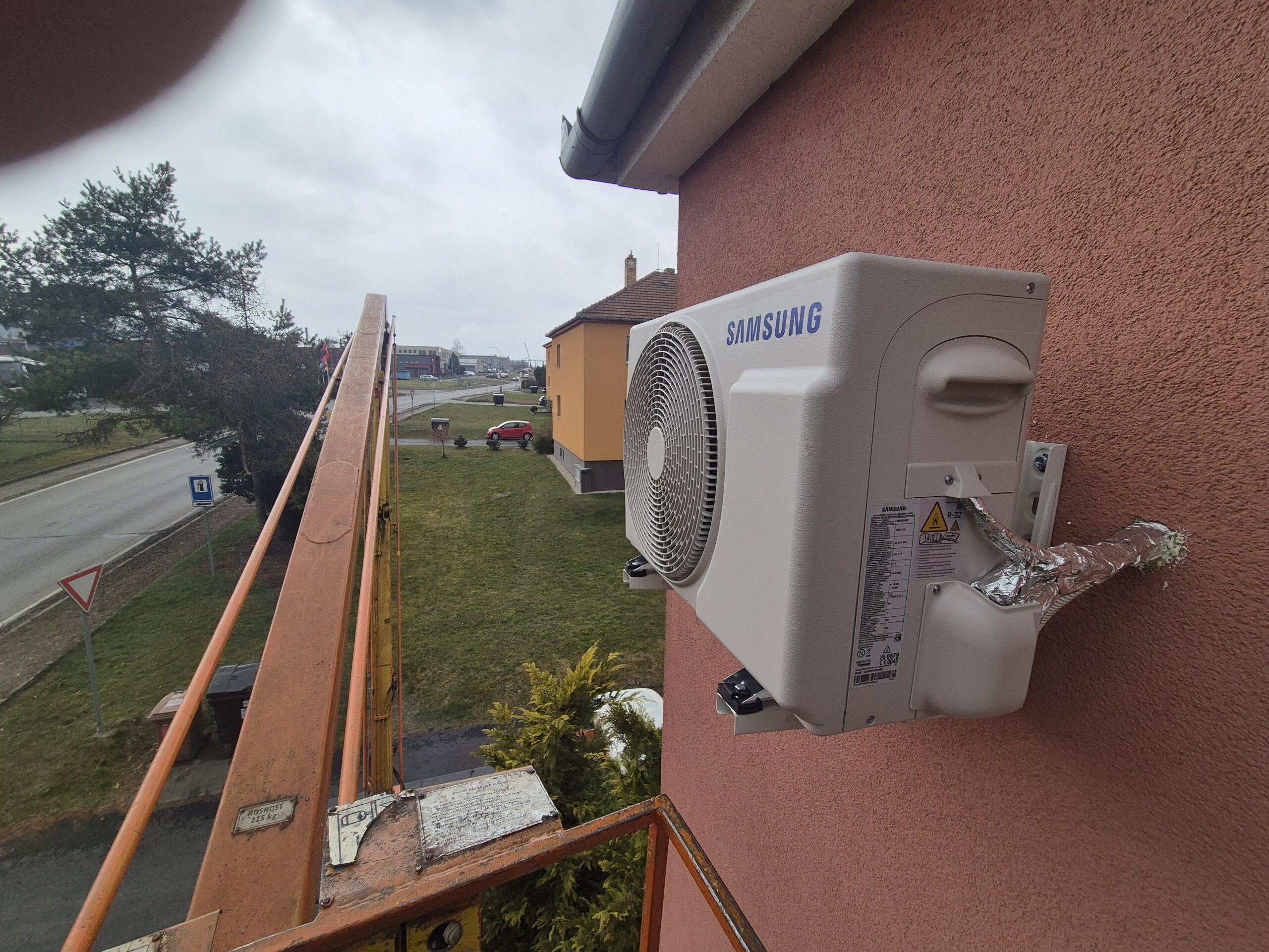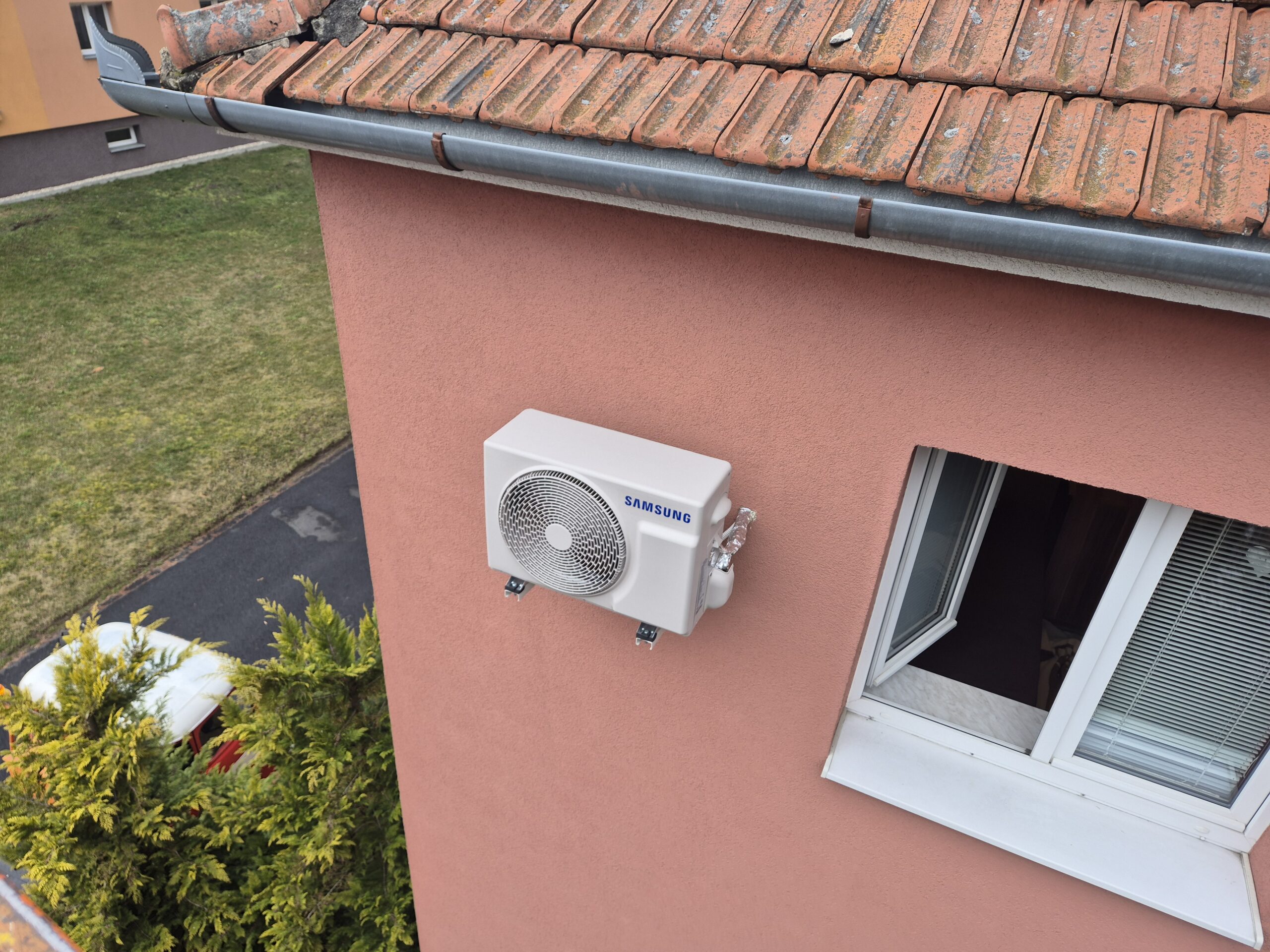 Vnitřní jednotka byla umístěna v obytné místnosti tak, aby bylo zajištěno rovnoměrné proudění vzduchu a maximální komfort při chlazení i vytápění. Průchod chladivového potrubí, elektroinstalace a odvodu kondenzátu byl proveden přímým prostupem skrz zeď. Venkovní jednotka klimatizace Samsung byla osazena na fasádu objektu. Vzhledem k výšce instalace bylo nutné využít pracovní plošinu, která umožnila bezpečné a přesné uchycení jednotky včetně antivibračních prvků.